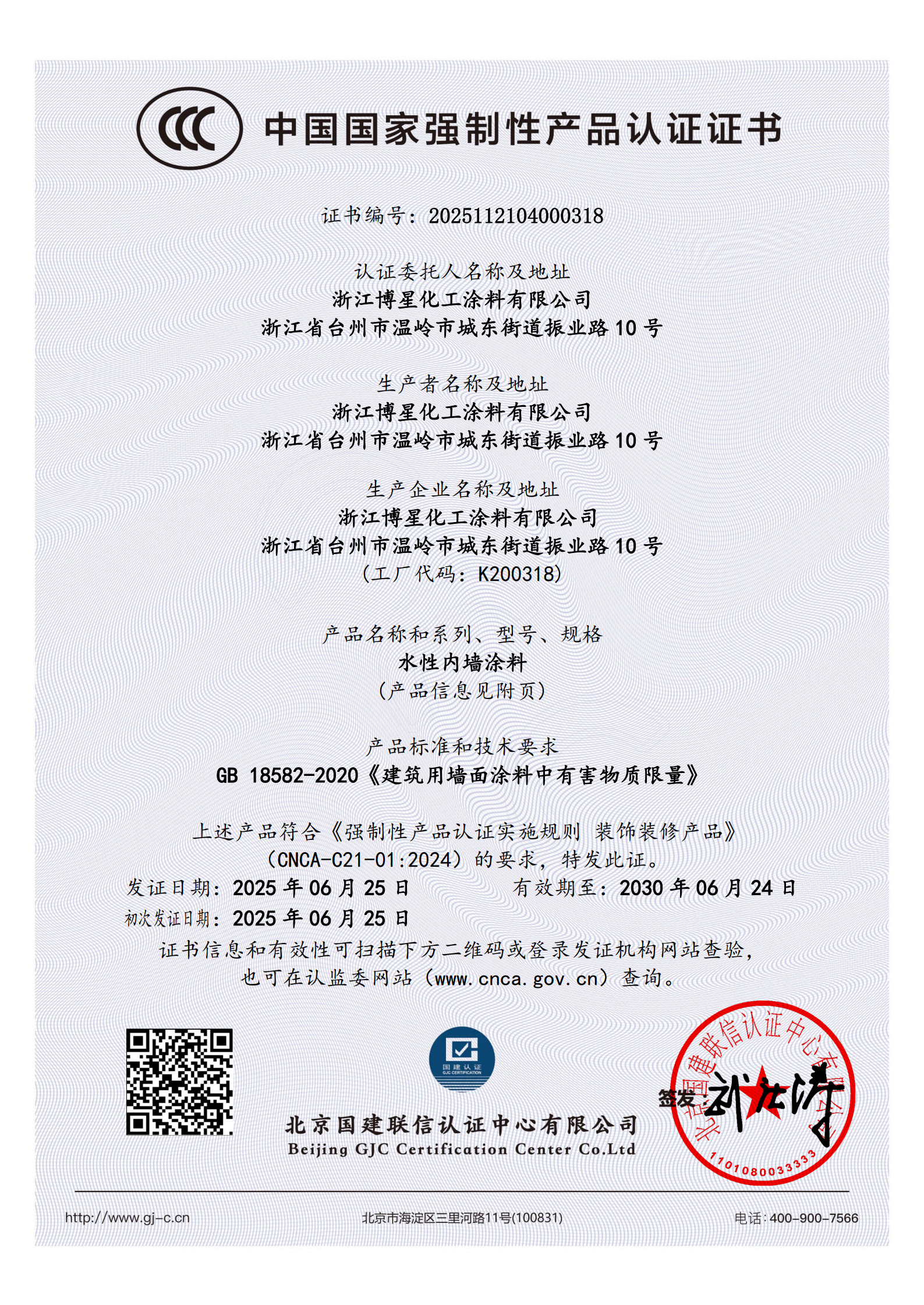 水性内墙涂料3C认证证书