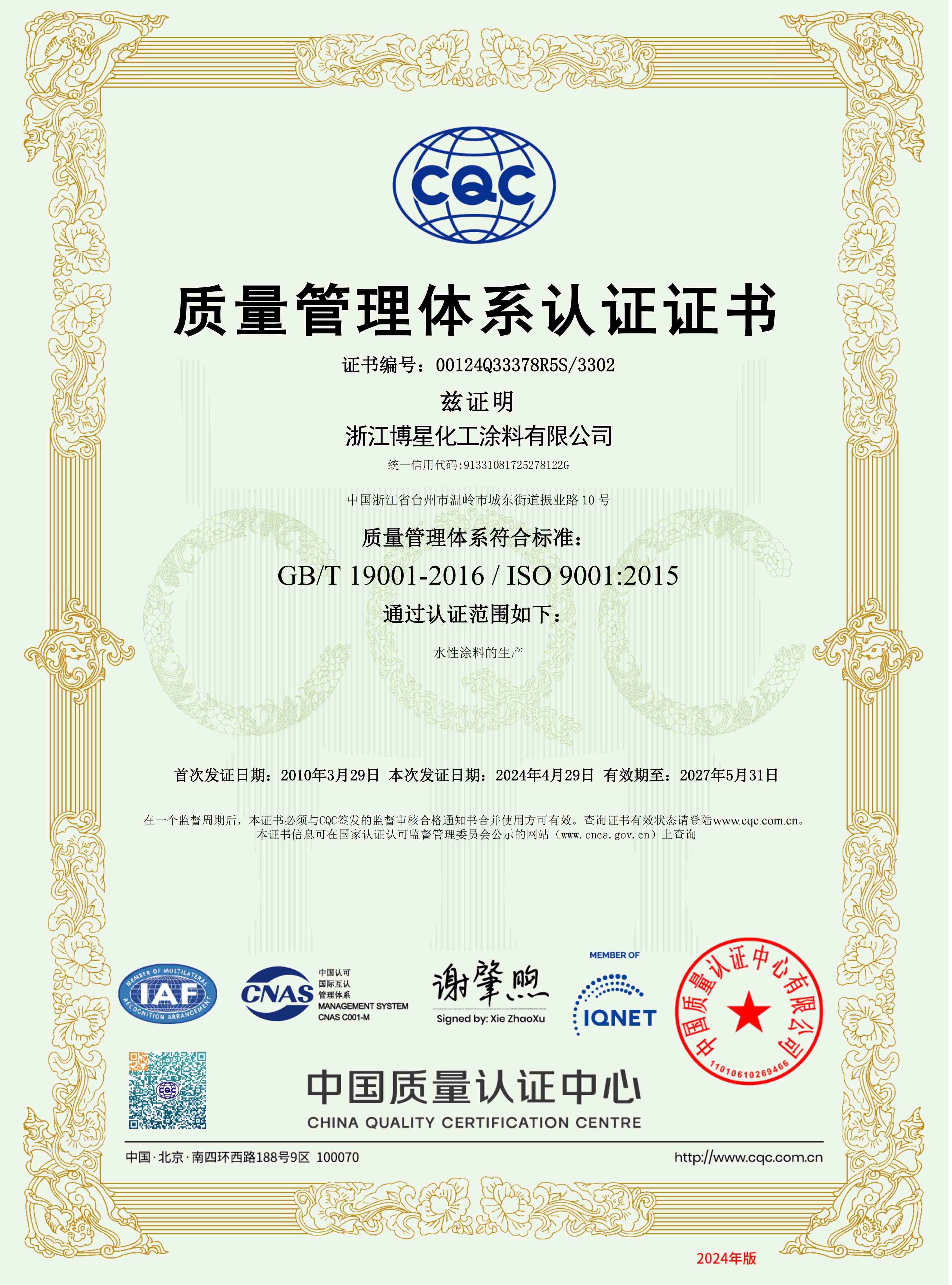ISO9001质量管理体系认证证书