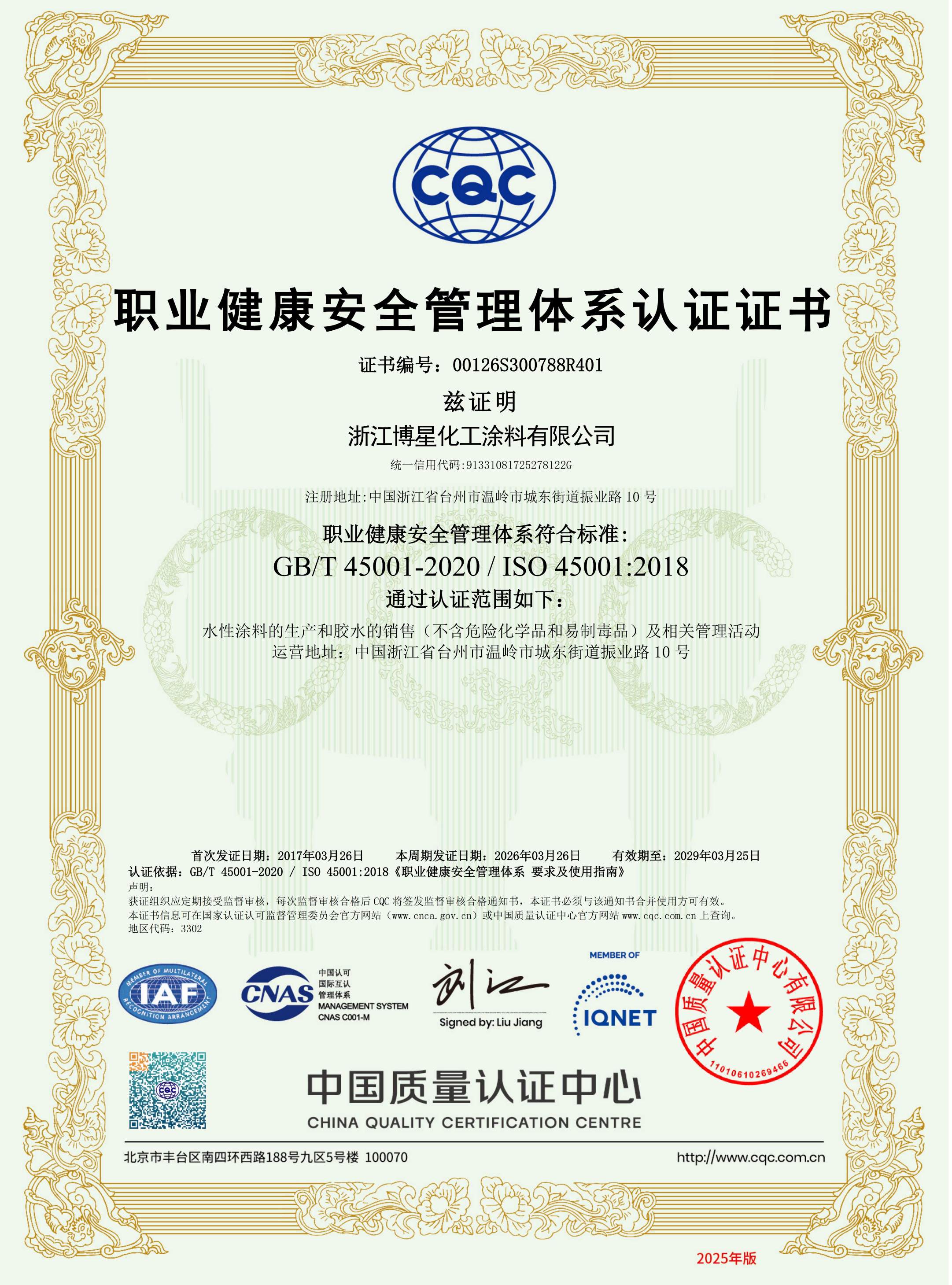 ISO45001职业健康安全管理体系认证证书